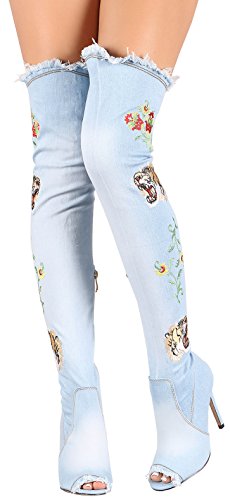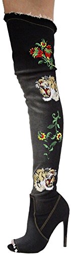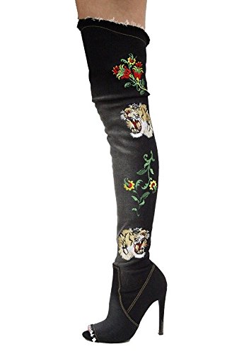 Binding : Apparel Product Description These stunning over-the-knee Elnora-96 boots by Cape Robbin feature a peep toe silhouette with frayed detail, embroidered design, stiletto heel, a slightly cushioned insole, and partial side zipper closure for easy on/off.. Heels 4.5", Tall 27", Shaft 22.5", Circumference Opening 18" 0