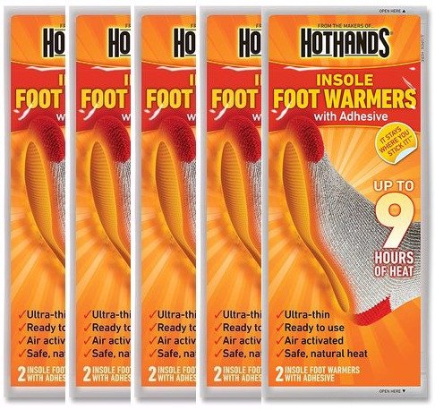-. Feature : 5 pair insole foot warmers per pack / Up to 9 hours of heat per warmer / Air Activated / Safe, Natural heat / Adhesive keeps the product in place / Each pair provides up to 9 hours of heat with adhesive on one side so it stays where you stick it / Ready to use, Air activated / Contains 5 pairs per package