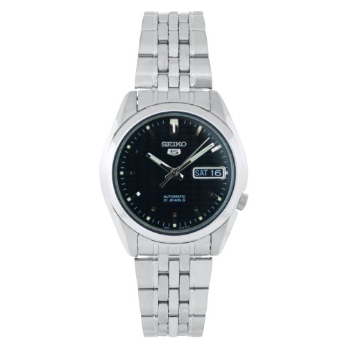 With trademark style and remarkable construction, the Seiko Men's Stainless Steel Analog with Black Dial Watch delivers a remarkable presence on the wrist. This stunning timepiece begins with a round 37mm stainless steel case with a fixed stainless steel bezel and a textured crown at the 4 'o clock position. These elements cradle a bold black dial, which is protected by a scratch-resistant hardlex crystal and features luminous dot and silver-toned index hour markers and luminous silver-toned hands powered by automatic self-wind movement. The dial also features a date display window at the X 'o clock position. A stainless steel link bracelet straps this watch to the wrist, while a fold-over clasp ensures its secure placement. Finally, this watch boasts water resistance up to 99 feet (30 meters). With a transcendent, debonair quality, this watch is a must-have for any discriminating collector of timeless timepieces.Feature