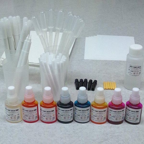 | セット内容 | インク(オレンジ×2・マゼンタ×1・ピンク×1・レモン×1・ブルー×1・ブラック×1・うすめ液×1/各13g) 洗浄液(50g×1) ボディペイントブラシ空容器×20セット ラベル×20枚 100ccディスポビーカー×10個 ディスポピペット×10本 色チェック用ニブ×30枚 色チェック用紙×5枚 紙ウエス×5枚 |