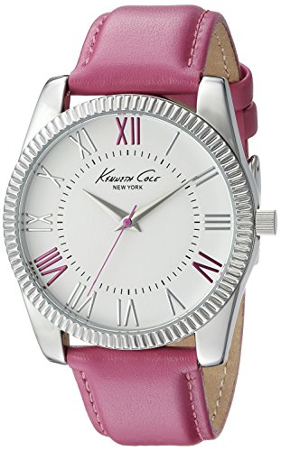 -. Feature : Silver-tone watch in stainless steel with black Kenneth Cole New York logo on a white dial with numerals at 1-2 and pink details at 4, 8, and 12 and silver details with coin-edge bezel / 38 mm stainless steel case with mineral dial window / Japanese quartz 3-hand analog movement with sweeping second hand display / Genuine leather strap with solid stainless steel buckle with keeper/closure / Water resistant to 30m (99 ft): In general, suitable for hand-washing and rain exposure, but not swimming, diving or snorkeling