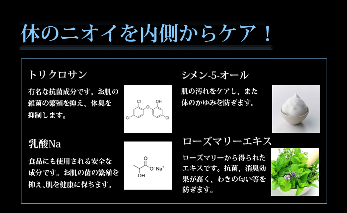 全成分 水、パチルミチン酸エチルヘキシル、セタノール、BG、ステアリン酸グリセリル(SE)、グリセリン、カキタンニン、硫酸(AL/K)、アスコルビルゴシド、ローヤルゼリーエキス、酢酸トコフェロール、トリクロサン、シメンー5-オール、乳酸Na、ローズマリー葉エキス、スクワラン、カルボマー、キサンタンガム、ステアリン酸ソルビタン、水酸化K、香料、メチルパラベン