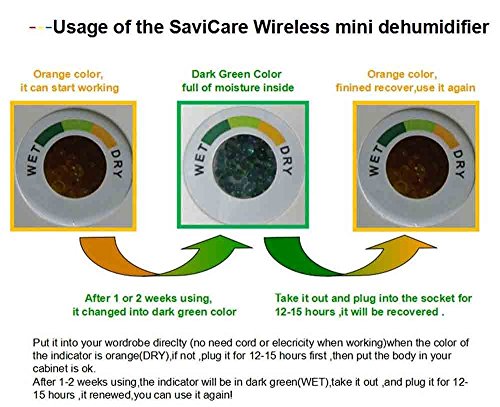 - When the silica gel crystal built-in the small window indicator changes the color from Orange(dry) to Green(wet), means that the dehumidifier is filled, you just need to simply plug it to any AC wall Outlet within 48 hours in well-ventilated area, appreciated next to the opened window, it could refresh itself to be as new as first time use.