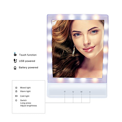 ❤3 WORKING MODES 18 LEDs: There are four touch control buttons, three of which are for mode switch. From the left to right, ① warm light mode for see the pore of face clearly; ② cold white light mode for checking your make-up and finding out the flaw of your make-up; ③ day light white mode. The last one is a power button.