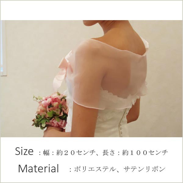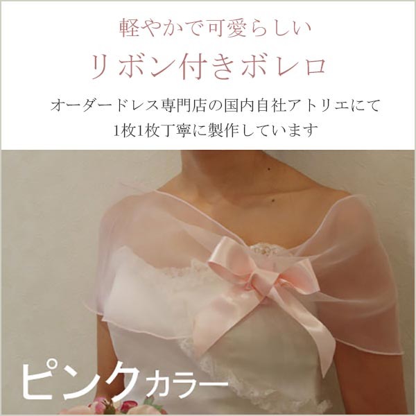 軽やかで可愛らしい、ショール(ボレロ)です!オーガンジーの軽い素材にワンポイントで愛らしいサテンリボンが施されたショールです。シンプルですがインパクトがあり、かわいらしいデザインに仕上がりました。カラーはピンクです。上品な光沢があるサテンリボンが華やかさをアップしてくれ、ウェディングドレスのお色直しはもちろん、ゲストドレスやパーティードレスとのコーディネートにもお使いいただけます。少し露出を抑えたいときにパッとはおるだけで、ほんのりあたたかく、おしゃれで一石二鳥。リボンは縫いつけてあります。裏面の半透明スナップボタンで留めるだけなので、着脱はかんたんです。【検索キーワード】ウェディングドレス/ウエディングドレス/白ドレス/マリッジ/ブライダル/ガーデンウェディング/フォトウエディング/花嫁/新婦/ブライズ/挙式/結婚式/披露宴/パーティ/パーティー/チャペル/教会/人前式/セレモニー/海外/リゾート/ホテル/式場/2次会/1.5次会/前撮り/アクセサリー/ヘアアクセ/ウエディング小物/ウェディング小物/Wedding/Bridal/ギフト/プレゼント/贈り物/