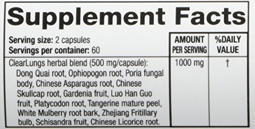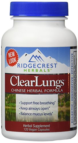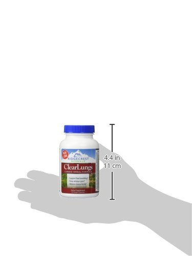 -. Binding : Health and Beauty -. Brand : RidgeCrest Herbals -. Department : Health and Personal Care -. EAN : 0355724001360 -. Feature : 120 Capsules / Serving Size: 2 / 60 Servings Per Container -. IsAdultProduct : 0 -. Label : Ridgecrest Herbals -. LegalDisclaimer : Actual product packaging and materials may contain more and different information than what is shown on our website. We recommend that you do not rely solely on the information presented and that you always read labels, warnings, and directions before using or consuming a product. Please see our full disclaimer below. -. Manufacturer : Ridgecrest Herbals -. Model : 915140 -. MPN : 136 -. PackageQuantity : 1 -. PartNumber : 136 -. ProductGroup : Health and Beauty -. ProductTypeName : HEALTH_PERSONAL_CARE -. Publisher : Ridgecrest Herbals -. Size : 120 Veg Capsules -. Studio : Ridgecrest Herbals -. Title : Clear Lungs Red Label 120 Capsules -. UPC : 355724001360
