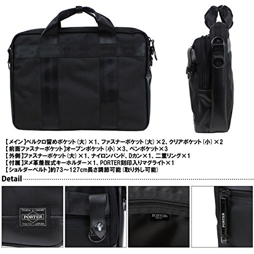 -. Feature : サイズ W410/H300/D90mm / 重さ 1,200g / 素材 表:バリスターナイロン(ウレタンコーティング) 付属:ターポリン / 【メイン】ベルクロ留めポケット(大)×1、ファスナーポケット(大)×2、クリアポケット(小)×2【前面ファスナーポケット】オープンポケット(小)×3、ペンポケット×3【外側】ファスナーポケット(大)×1、ナイロンバンド、Dカン×1、二重リング×1 / 【付属】ヌメ革着脱式キーホルダー×1、PORTER刻印入りマグライト×1【ショルダーベルト】約73~127cm長さ調節可能(取り外し可能)