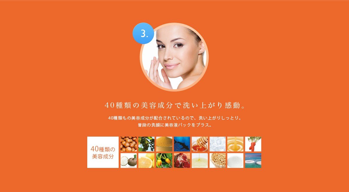 16種類が植物エキスを始め計40種類の美容成分を全体の90%配合。肌にやさしい洗顔ができます。