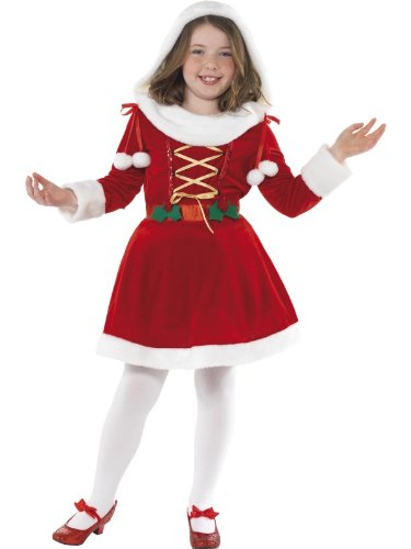 Studio : Smiffy s USA Publisher : Smiffy s USA Binding : Toy Product Description We just love the extra attention to detail on this Girls Little Miss Santa Costume. This costume features a red velvet dress with white faux fur trim just like all standard Miss Santa costumes. What makes this one so special is the addition of crisscross lacing in the front, dangling pom-pom trim in the collar and holly leaf details on the belt. The costume also has an attached hood trimmed in white fur. Add some toasty warm opaque white tights and a pair of sparkly red glitter Mary Janes for a terrific holiday outfit that she can wear to a family party or Christmas pageant. Three different sizes make it great for girls between 4 and 12 depending on there size. Girls Christmas costume features a red velvet dress with white faux fur trim, pom pom and holly decoration and an attached hood. We just love the extra attention to detail on this. Size: Small, Medium, Large. Includes: Costume a red velvet dress with white faux fur trim, pom pom and holly decoration and an attached hood. White tights and red glitter shoes sold separately. 0