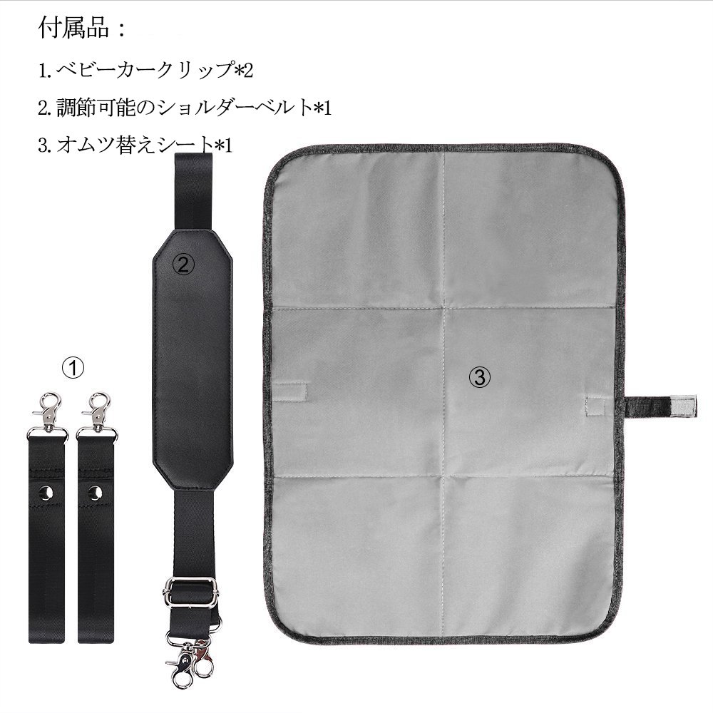 1 * Mothers Bag 1 * Diaper change sheet (34 cm * 54 cm) 2 * Stroller clip