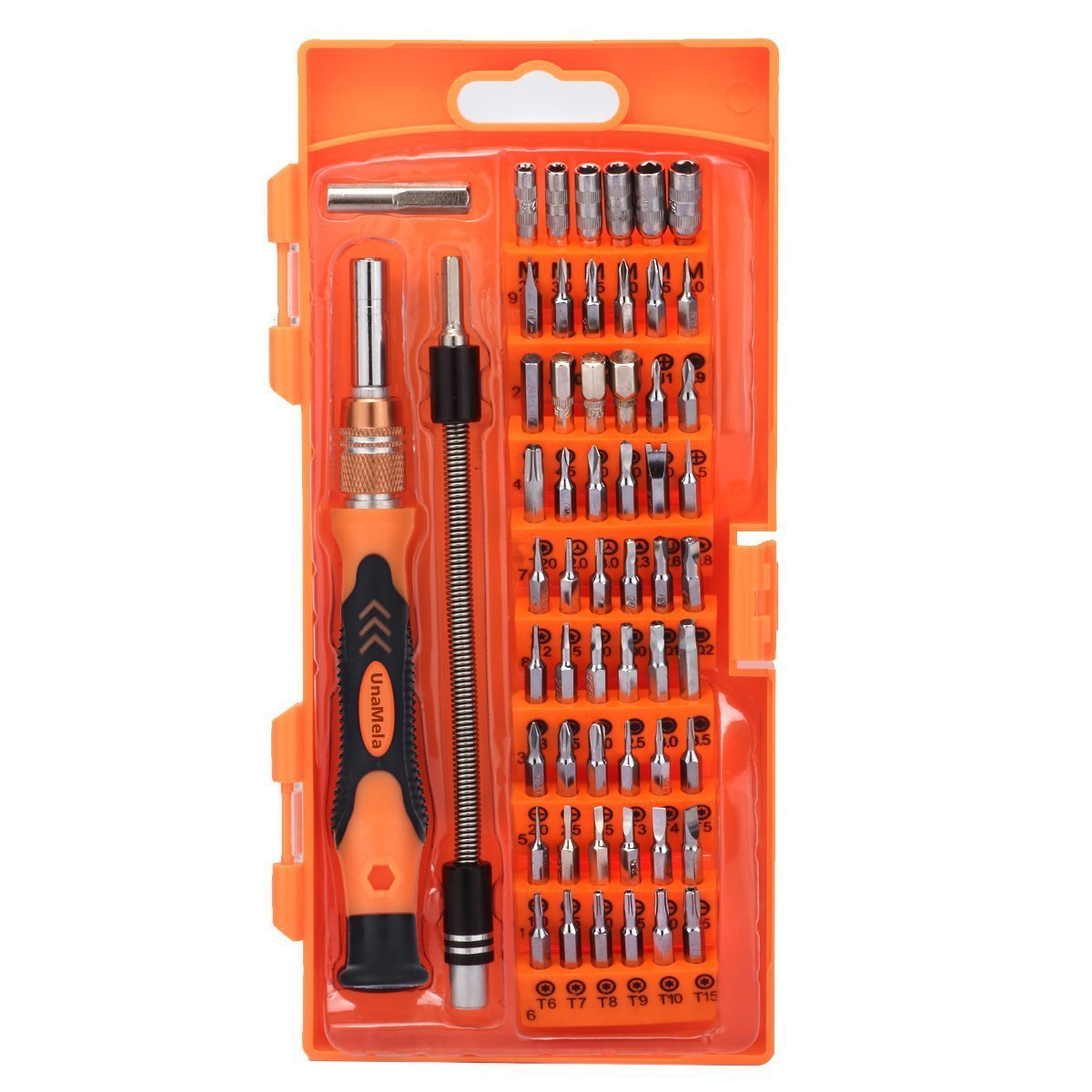 Multi-magnetic screwdriver bit kit: The magnetic screwdriver set comes with one extension rod, one connector, one multi-angle extension bar, one aluminum alloy non-slip handle, and 54 CRV sockets