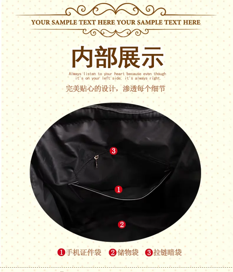 Inside: cell phone pocket document bag zipper pocket inside of the storage bags