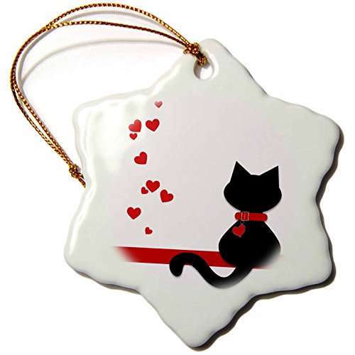 3dRose LLC orn_164791_1 Porcelain Snowflake Ornament, 3-Inch, "Pet Lovers Red Hearts Black Kitty Cat"