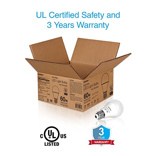 Studio : Tenergy Publisher : Tenergy Product Description Tenergy's LED 9W light bulb offers outstanding energy efficiency and long-lasting performance, which makes it an ideal 60-watt replacement bulb. *Please note: This is a non-dimmable light bulb. Do not use it with dimmer switches. Energy Saving, Long Lasting Estimated energy cost is $1.08 per bulb per year*, which consumes 85% less energy and lasts up to 20 times longer than incandescent bulbs. *Based on 3 hrs/day, 11¢/kWh. Tenergy offers 2 light colors in this product line: We have two options between soft white and daylight white. Soft white (2700K) LED light bulbs create a comfortable and cozy atmosphere. Daylight white (5000K) LED light bulbs shine similar to natural daytime which provides you with an environment to concentrate. *Confirm the color you need with the product title. Safe for Your Family and the Environment Free of toxic chemicals and breakable parts to keep your home safe and to take a big step toward a greener future! Technical Specifications: Lighting Technology : LED Number in Package : 16 bulbs Color Temperature (K) : 2700 Bulb Type : Household Bulb Shape : A-Line Indoor/Outdoor : Indoor Light Bulb Base Code : E26 Light Bulb Base Type : Medium Light Bulb Shape Code : A19 Wattage (watts) : 9 Light Output (lumens) : 750 Watt Equivalence : 60 Color Rendering Index (RA) : 80 Average Life (hours) : 15000 Dimmable : Non-dimmable Dimensions: Bulb Diameter (In.) 2.36 Product Depth (in.) 2.36 Product Height (in.) 4.29 Product Width (in.) 2.36 Package Contents: 16 x LED Light Bulbs (2700K Soft White) 0