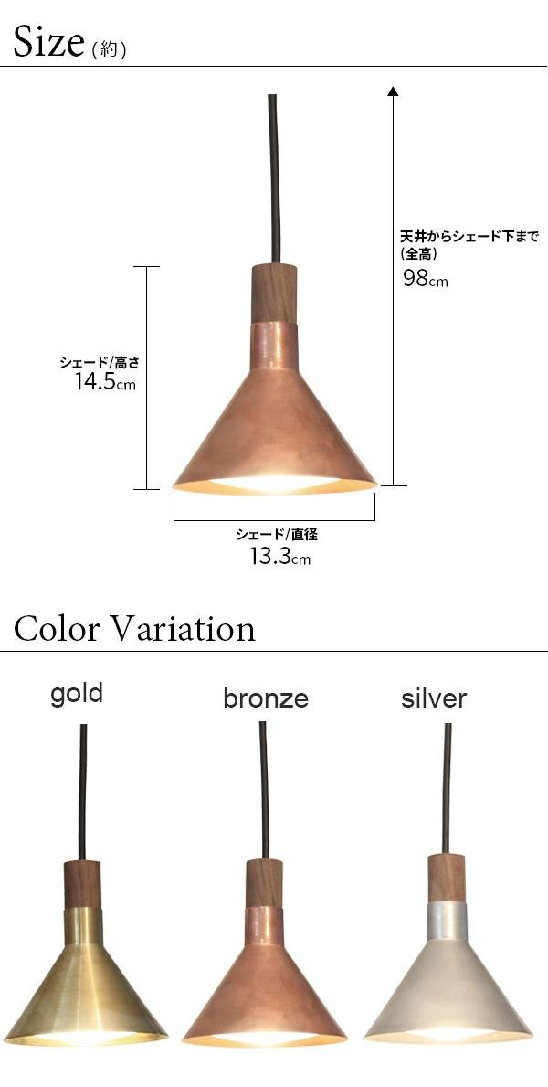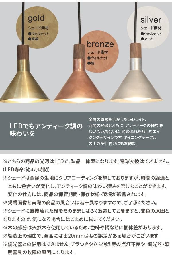 | 素材・材質 | 【gold】 シェード:ウォルナット、真鍮 LEDパーツ:アルミニウム、ABS樹脂 【bronze】 シェード:ウォルナット、銅 LEDパーツ:アルミニウム、ABS樹脂 【silver】 シェード:ウォルナット、アルミ LEDパーツ:アルミニウム、ABS樹脂 |