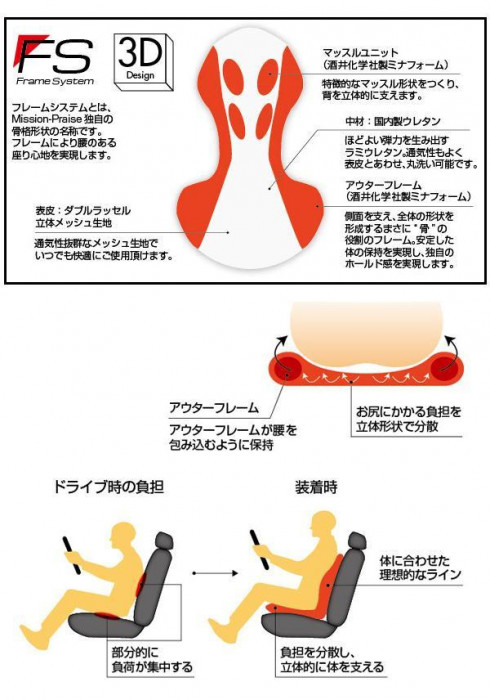 | 究極の座り心地を追求したデザイン!!臀部から肩までを包み込むようにサポートし負担を軽減する座席サポートクッションです。着座時の負担を軽減し、安定した走りを実現するために、面ではなく「3D」で支えるという方法にたどり着きました。立体で支えることにより負担を分散させ疲労感を軽減します。帰省ラッシュ・Uターンラッシュの渋滞など長時間のドライブにもおすすめです!! |