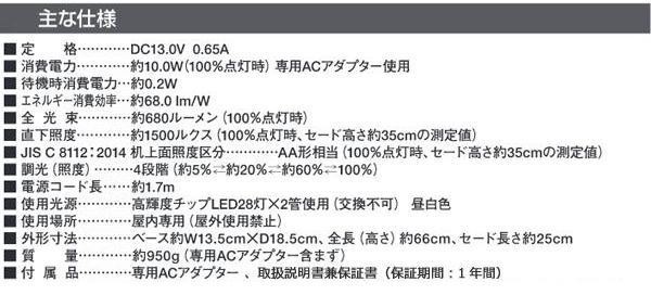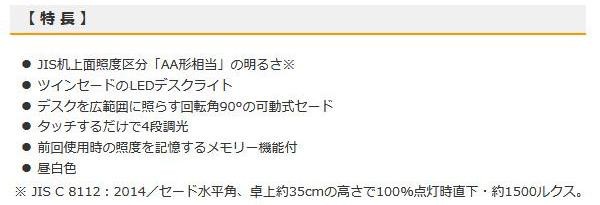fk094igrjsタッチするだけの4段階調光、前回使用時の照度を記憶するメモリー機能が付いたツインセード式のデスクライトですサイズ個装サイズ:15×45×7cm重量個装重量:1050g製造国中国デスクを広範囲に照らし出すツインセード式デスクライト※LED素子にはばらつきがあるため、同じ形名の商品でも商品ごとに発光色、明るさが異なる場合がありますのでご了承ください※仕様及び外観は改良のため予告なく変更する場合がありますタッチするだけの4段階調光、前回使用時の照度を記憶するメモリー機能が付いたツインセード式のデスクライトです