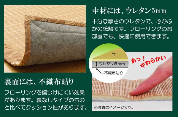 表地=竹 裏地=不織布 中材=ウレタン6mm ヘリ=綿100%
