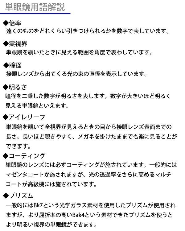 | 仕様 | 倍率:8.0倍 対物レンズ有効径:21mm 実視界:7.0度 瞳径:2.6mm 明るさ:6.8 プリズム:Bk7 マゼンタコート 最短距離:6m |