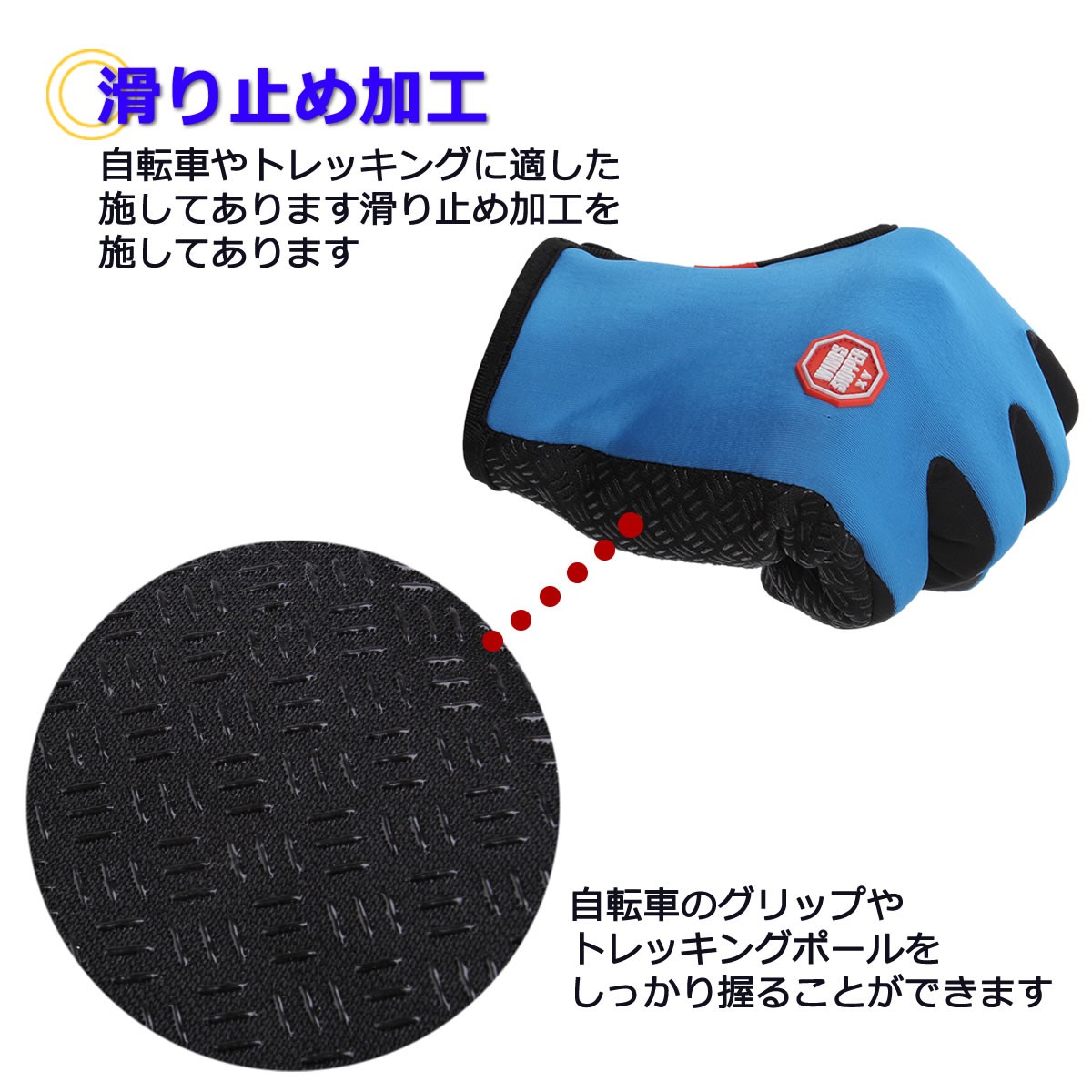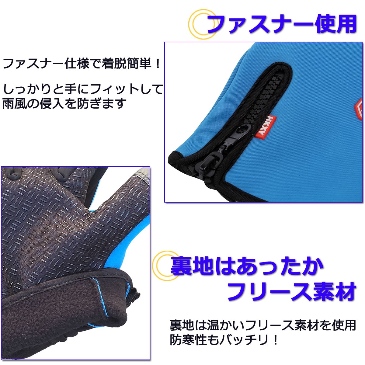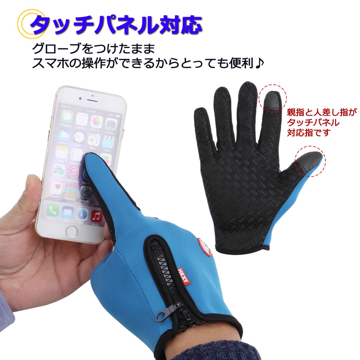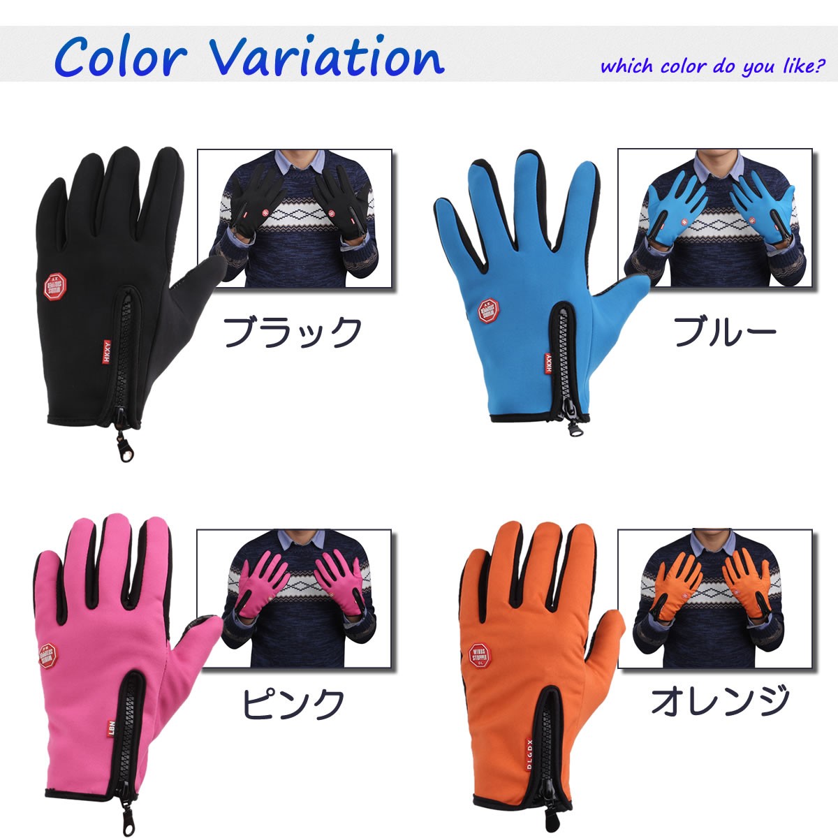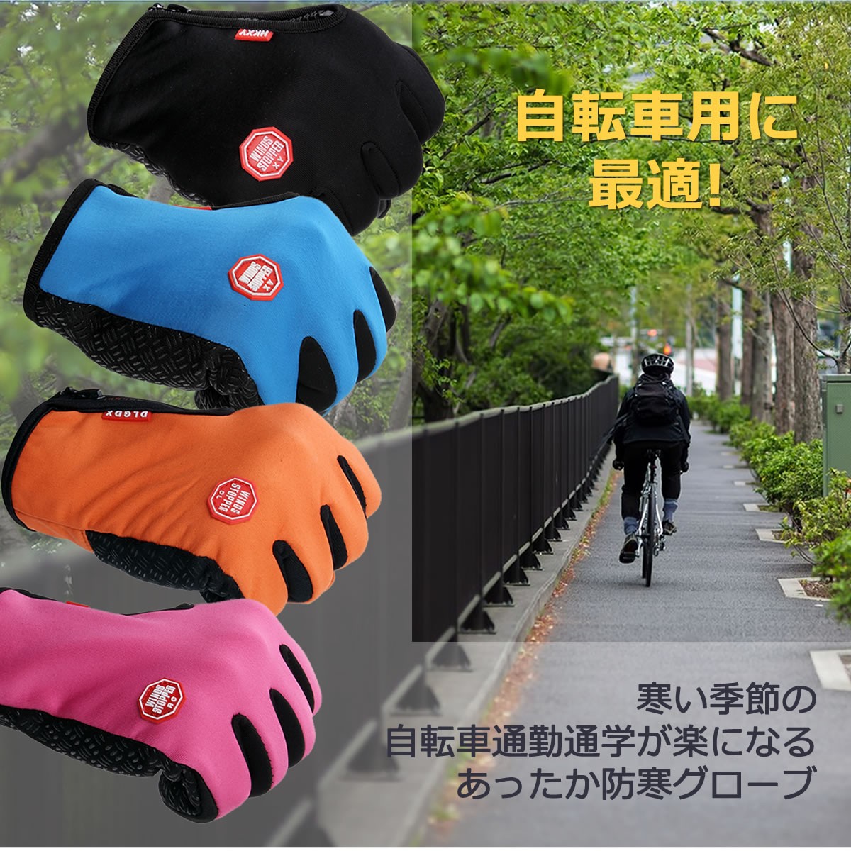 あらかじめご了承下さい。寒い冬の自転車通勤が楽になるあったかグローブ自転車での通勤や通学の寒さ対策に最適です!【おすすめポイント】◆滑り止め加工:自転車やトレッキングに適した滑り止め加工を施してあります。◆裏地あったか:裏地には保温性の高いフリース素材を使用。防寒性バッチリです。◆液晶タッチパネル対応:親指と人差し指がタッチパネル対応指となっており、手袋をしたままスマホやタブレットなどの操作をすることができます。◆撥水加工:撥水加工が施してあるので雨や雪などが浸透しにくくなっております。◆ファスナー使用:ファスナーだから着脱簡単。しっかりと手にフィットして雨風の侵入を防ぎます。【仕様】材質:ポリエステルサイズ:S~XL手のひら周り(約):S(16~18cm)、M(18~20cm)、L(20~22cm)、XL(22~24cm)カラー:ブラック、ブルー、ピンク、オレンジ【注意】※ご使用のパソコン環境によっては、実物とモニター上のカラーが 若干異なる場合がございます。 ※ゆうメールでの発送となります。※配達日、配達時間の指定はお受けできません。※追跡番号はついておりません。あらかじめご了承下さい。