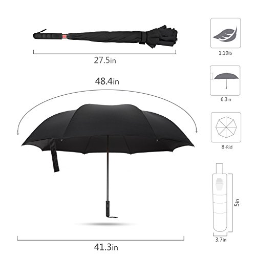 Product Specifications: Size: 41.3 inch (open diam), 27.5 inch (length), 48.4 inch (length of canopy) Fabric Material: Double layer high-density water repellent fabric. Rib Material: Carbon fiber high hardness skeleton, reinforced windproof frame. Rods Material: Aluminum alloy anti-corrosion stable rods. Handle Material: Rubberized plastic matte painting ergonomics handle. Umbrella Fabric Density: 210T. UV proof: UPF50 . Weight: 1.19 lb.