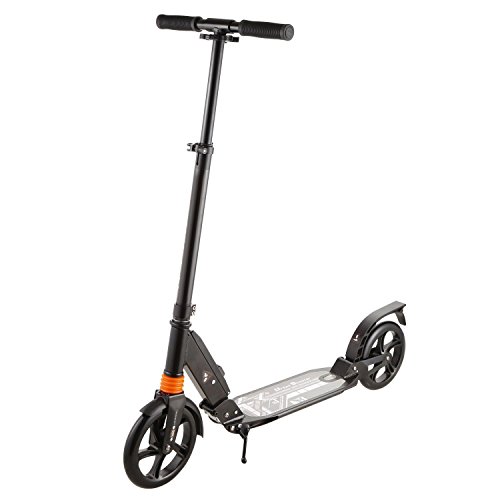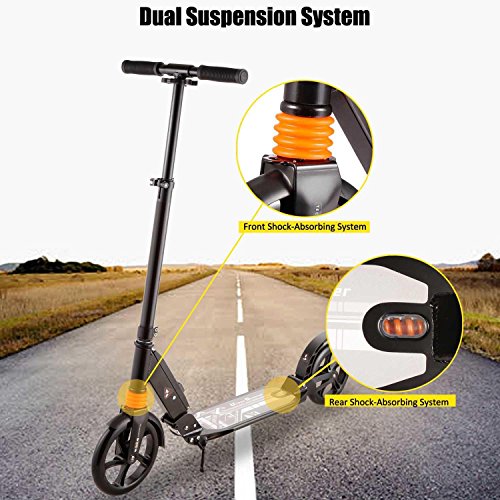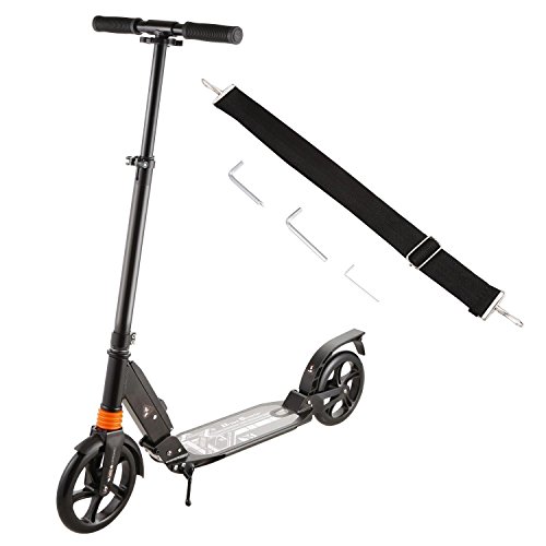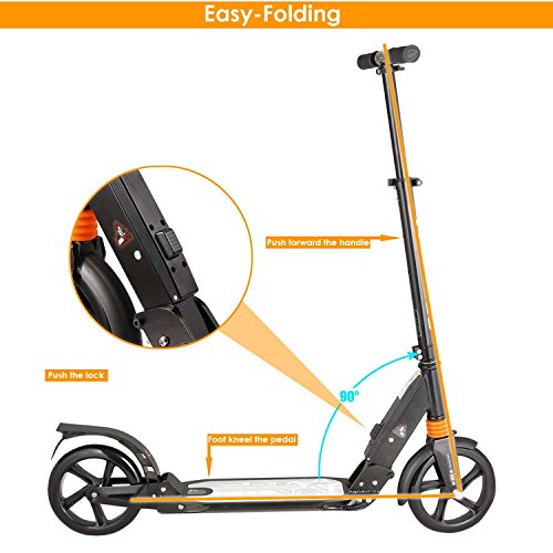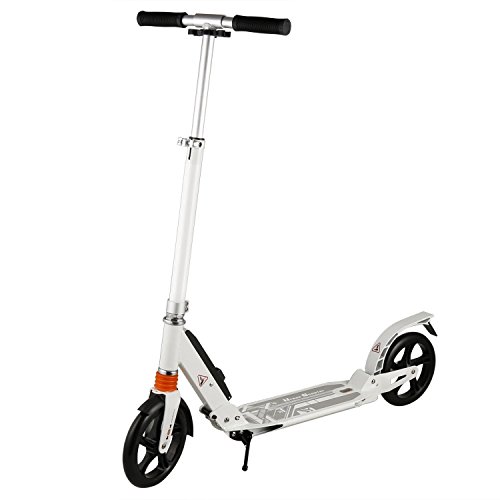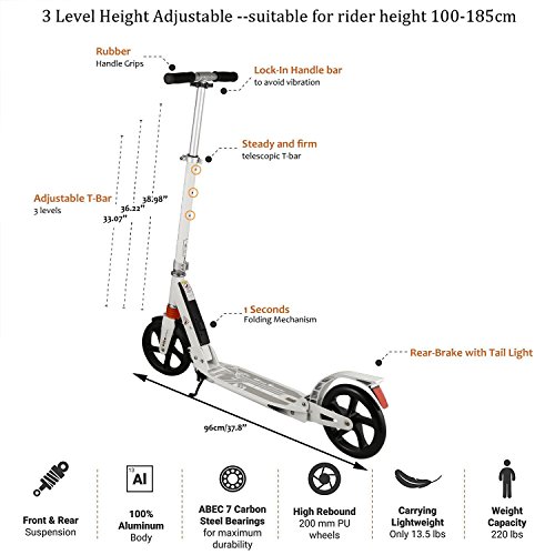 -. Feature : Sturdy & Durable: A high density aluminium alloy frame that can easily hold up to 220lbs (100kg).Suitable for riding on City/Urban/Suburban pavements / Adjustable Height: Foam cover detachable T-bar and 3 Levels Adjustable Height (range 84-92-99cm/ 33.07-36.22-38.98 inch) design for your needs. Ideal for adult or above 12 years old child / Dual Suspension and Patented Rear Brakes:The aluminum alloy scooter features Dual Suspension System and an easy to access Anti-Rust Paint Foot Rear Brakes with which when pressed brings the scooter to a speedy secure stop. Large aluminum reinforced brake pedal is easy to use for quick and firm breaking fast / 2 Large Wheels: Made of high rebound and high quality PU wheels , mounted on precision bearings, make a smoother ride, ideal for city uneven pavement / Portable & Foldable: Folding design make the 2 wheeled scooter easy to carry and convenient to store.It's the perfect and easiest way to commut and unlike a bicycle there are no restrictions to carry on the tube, train or bus