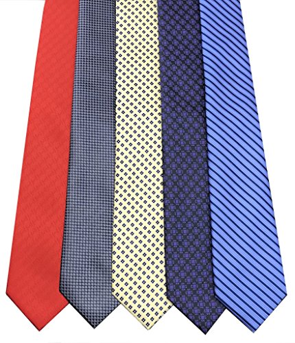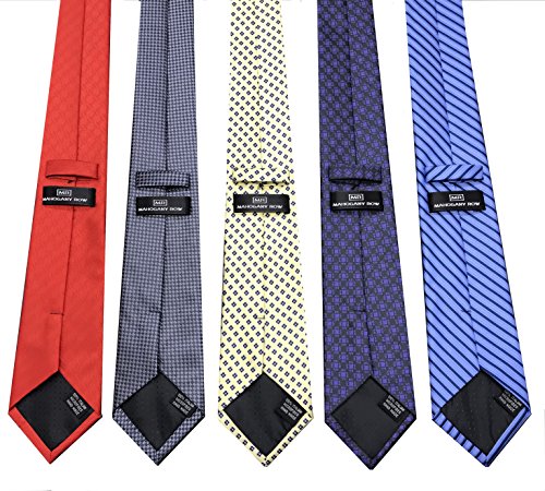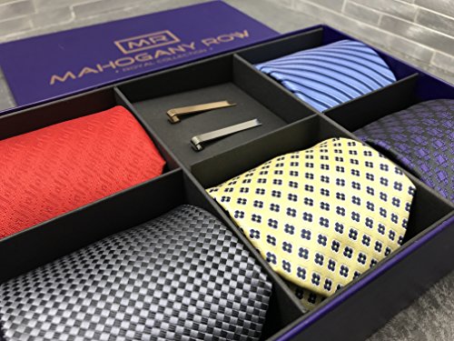 Binding : Apparel Product Description Our stylish ties pair well with and will match many Men's Suit accessories: cufflinks, lapel pins, suspenders (often looks better than with a bow tie). Add this to your collection of knit ties, cotton ties, wool neckties, skinny ties, paisley ties Mahogany Row's Executive Collection creates modern luxury by featuring a slim-modern cut, expertly woven 100% Italian microfiber that creates that soft feel, smooth texture, and perfect drape. Our newest collection features a set of 5 contemporary patterned and solid ties with 2 tie bars to fit all the needs of any trendy, classy, and stylish man. Our ties are designed to be used in your everyday wardrobe, and will always make a great statement. THE EXECUTIVE COLLECTION SET INCLUDES: THE GRAY WEATHERED TIE - In the middle of winter, you'll want a tie to pair with your heavier-weight suits. THE SOLID BLACK TIE - For formalwear occasions, for a gray suit with a white shirt, or for a leather or jean jacket. Exceptionally versatile. THE PIN-DOT TIE - Like a polka-dot, but much smarter and more subtle. THE CLUB TIE - Any tie with a repeating logo. Once just for the Ivy League set, now for anyone with serious style. THE REPP TIE - Still a Capitol Hill staple, but now cut skinny for the cool kids. THE CHROME TIE BAR - Simple understated style, The chrome tie clip ties together your polished look. THE BLACK CHROME TIE BAR - The smallest details make the biggest impact. This black chrome tie clip adds a little debonair to your everyday look. HIGHLY RECOMMENDED - Secure the tie bar between the 3rd or 4th buttons of your dress shirt first, Then slide the shell with the tail into the tie bar to ensure a sleek secure fit. Formal tie for prom, homecoming, business interview, Fathers Day gift Business professional, Blue tie, Blue necktie, Black necktie, Grey necktie, Gray necktie, Grey tie, Pin dot tie, 100% Silk necktie, 100% Silk tie, Neckties for men set, Groomsmen gift, Groomsman gift, Best man gift, Wedding gift, Affordable luxury 0