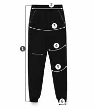 | 尺码 | ①裤长 | ②腰围 | ③臀围 | ④大腿围 | ⑤膝围 | ⑥脚围 | ⑦前裆 | ⑧后裆 | ||
