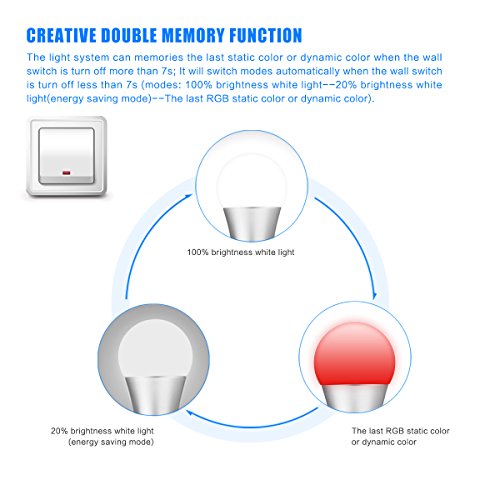 - ★ Works as a Wake Up Light: This updated RGBW Colour Chaning Light Bulb add the sleep mode, you can use it as a night lamp, compared to other night lamp on the market, its brightness increased 5%, meanwhile, when you wake up in the morning and use the sleep mode, this light will gradually lit in 7 seconds, so that the eyes feel better to adapt