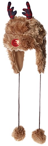 Product DescriptionChristmas themed trapper hat with reindeer nose antlers and with hanging poms0