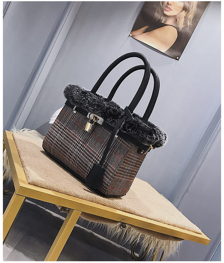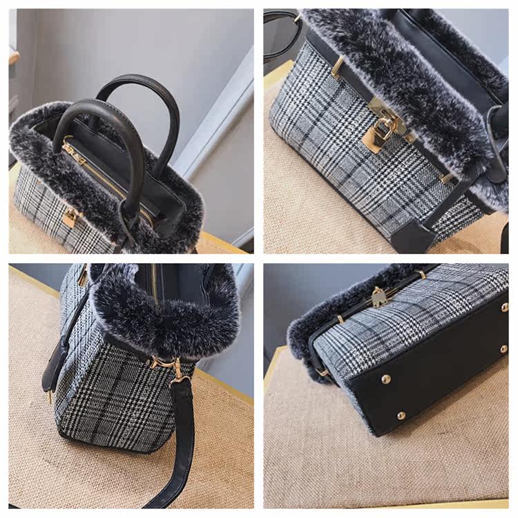 时尚毛绒水桶包女新款撞色毛呢手提包冬季毛毛包单肩斜挎包