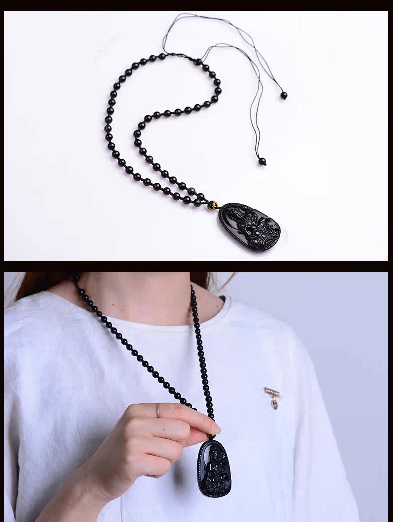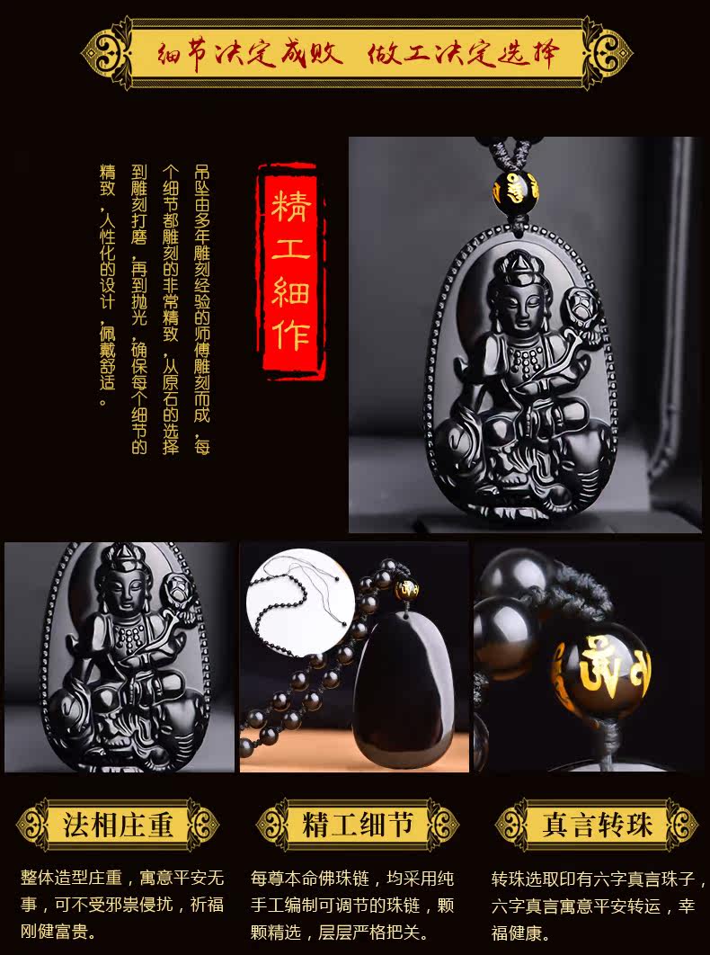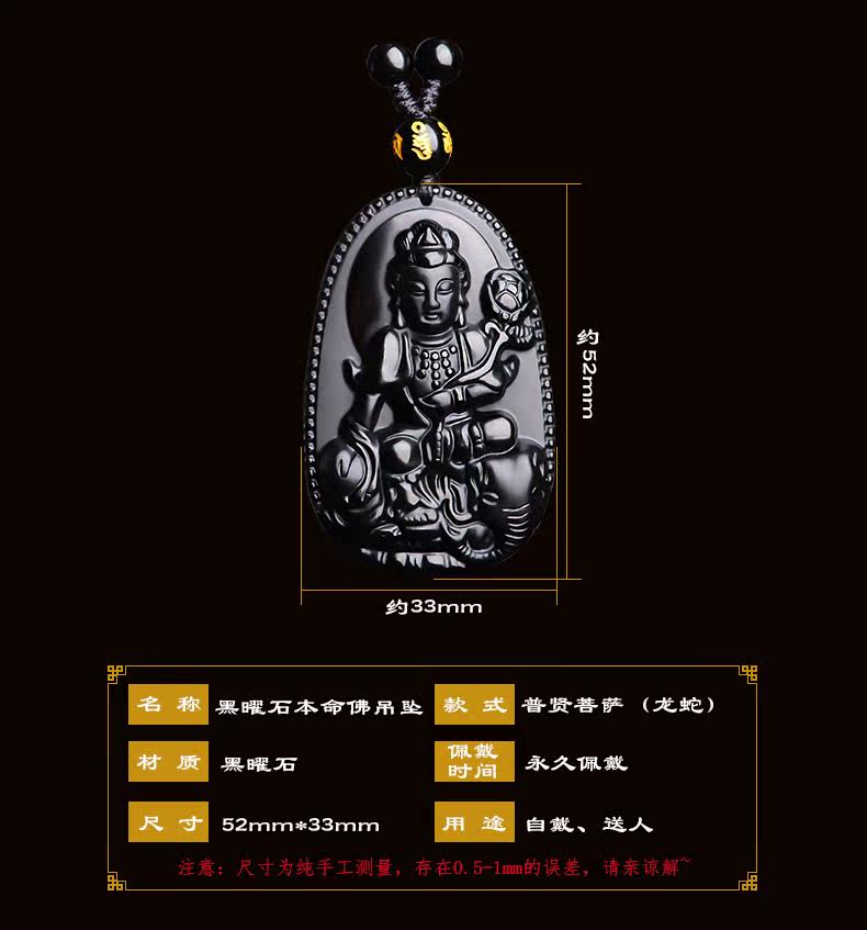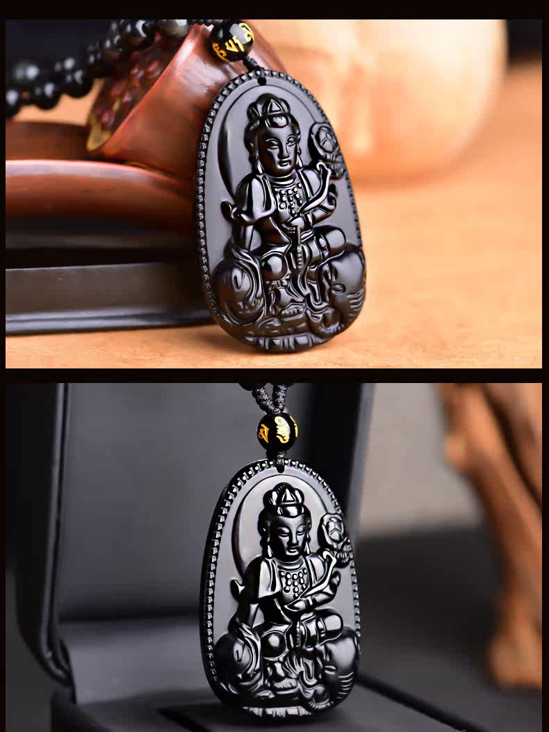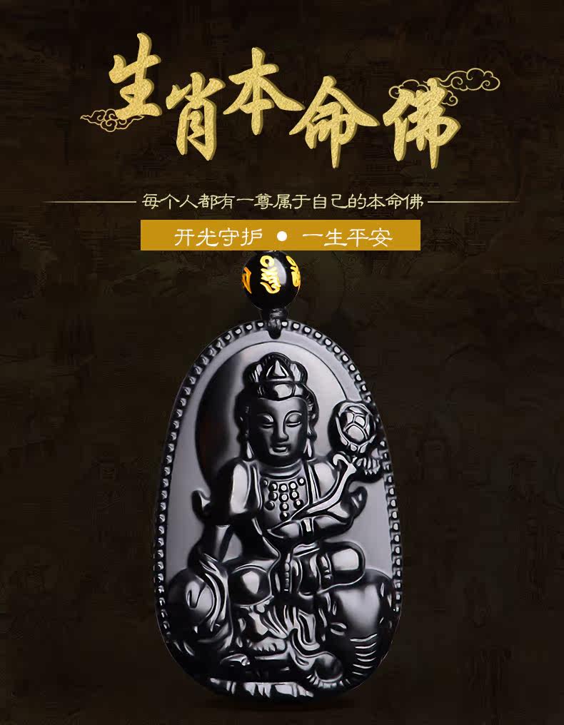 开光 天然黑曜石生肖守护神吊坠 普贤菩萨属龙属蛇本命佛男女项链