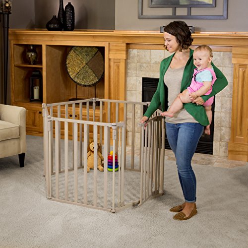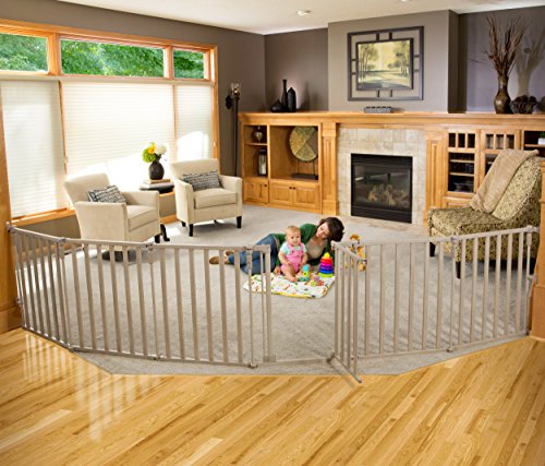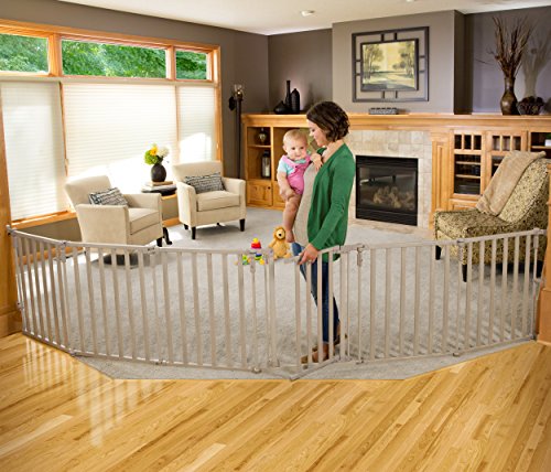-. Feature : This item is versatile- as a barrier it measures over 12 FT wide, when used as a play yard, it encloses 10 square FT. It is 30" tall. / Includes six panels. One of the panels is a gate door for easy access. / The lower gate mounts move independently to adapt to most molding. / Self- closing, hold-open gate door with double locking system for safety. / JPMA approved
