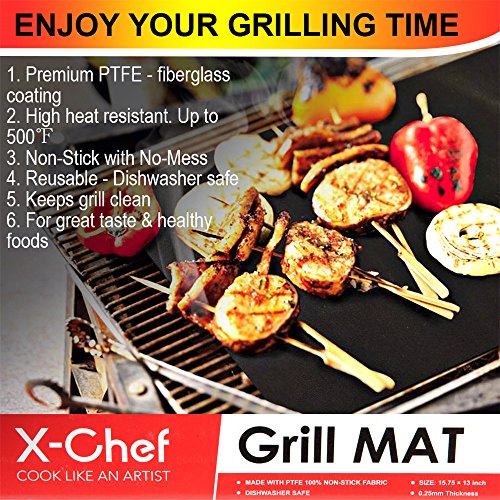 - DECENT SIZE FITS MOST BARBECUE GRILLS: Measuring 15.75 x 13 Inch, X-chef BBQ Grill Mat works well with most grills like Weber, Charbroil, Big Green Egg, smoker, charcoal, propane, gas, or electric one. Besides, the mat can be trimmed to any size or shape to meet your needs! And both sides can be used for baking.