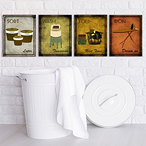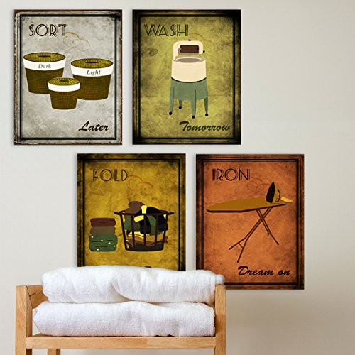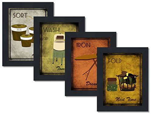 Set of four humorous laundry art prints printed on thick crescent matboard, measuring 8x10 inches each. Comes with hangers. Great for any home wall decor!