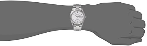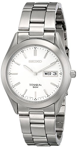 -. Feature : Titanium watch in brushed silver-tone finish featuring silver-white sunray dial with luminous hands and stick indices and day/date window at 3 o'clock / Japanese quartz movement with analog display / Protective hardlex crystal dial window with 37 mm case diameter / Features three-link bracelet with fold-over clasp and safety / Water resistant to 50 M (165 ft)