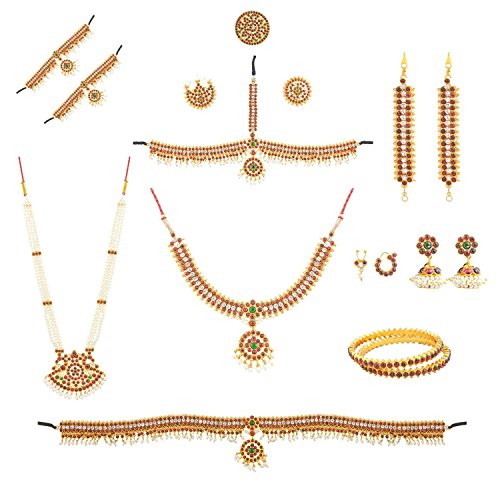 This piece of jewelry can be used for Bharatanatyam and Kuchipudi dance performens Total 10 items along with Headset (including sun & moon), necklace, haram, bajuband, ragadi,bangles, matil, jumki, belt and nath bullakku