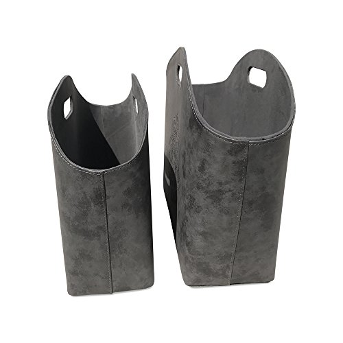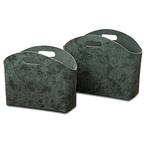 The Mandala Magazine Rack Organizers, Set of 2, Tooled Floral Details, Lush Gray Faux Suede, Cut Out Handles, Lined, Stitched, 16 and 18 1/2 Inches Tall, By Whole House Worlds