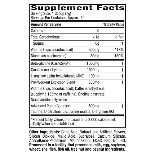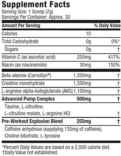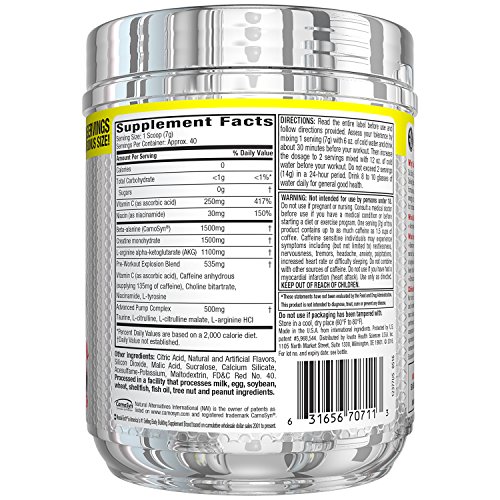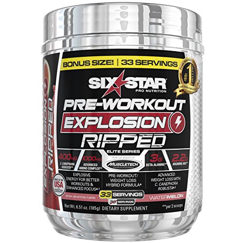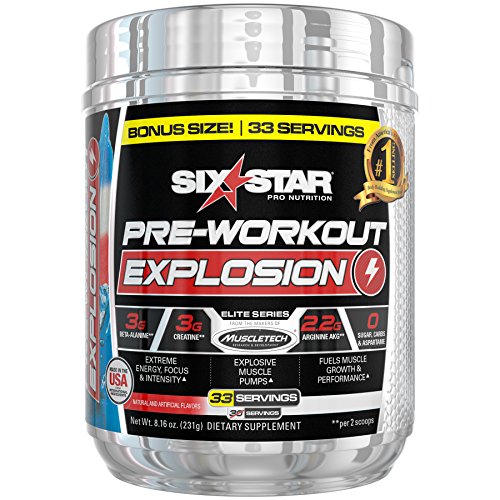 GET READY FOR THE BEST WORKOUT OF YOUR LIFE Get ready to crush the weights with Six Star Explosion! This premium, delicious-tasting pre-workout powder is formulated by world-leading supplement researchers to deliver an incredible energy boost, enhanced mental focus and skin-splitting muscle pumps for explosive workouts like you’ve never experienced before! SIX STAR EXPLOSION DELIVERS MORE SIZE, STRENGTH AND FORCES INCREDIBLE MUSCLE PUMPS Loaded with powerful ingredients like ultra-premium Carnosyn beta-alanine, the most studied form of creatine, arginine AKG and ultra-clean caffeine anhydrous, Six Star Explosion is the smartest choice you can make to fuel your hardest workouts and take your strength and performance to new levels! Six Star Explosion is from the makers of MuscleTech, America’s #1 Selling Body Building Supplement Brand, so you know it’s a premium formula you can trust to deliver results you can see and feel! Boosts energy with a scientifically researched dose of caffeine.Feature