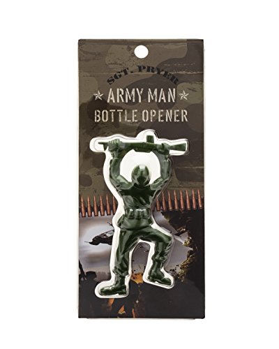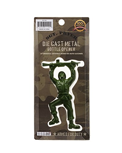 - ALWAYS READY FOR SERVICE. This bottle opener is a much larger replica of the original classic green army men most played with as kids and is not made of cheap plastic. In fact, it is made of die cast metal that fits perfectly in your hand and will take down every bottle cap that comes its’ way. No other backup is needed, the Sgt. Pryer bottle opener is always ready for service! Expect years of distinguished service.
