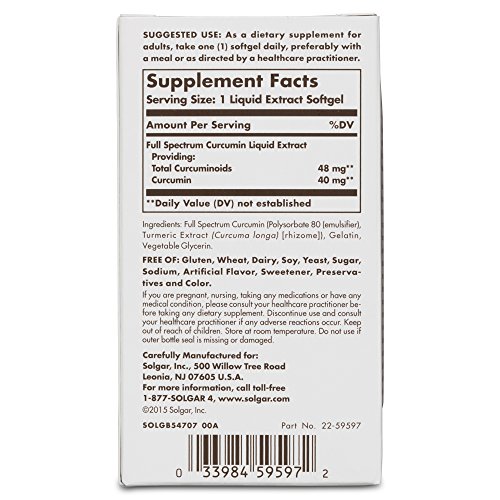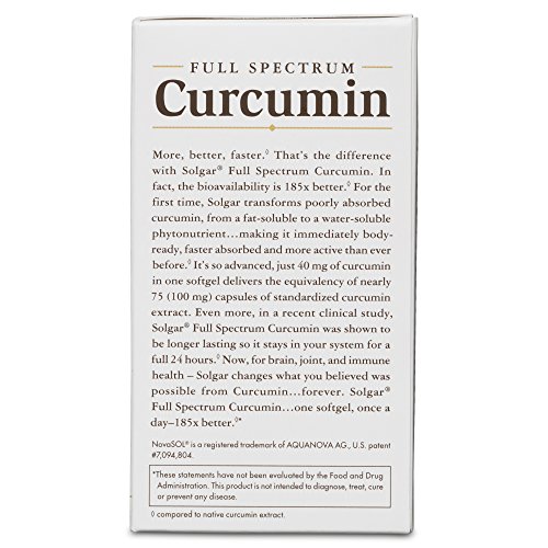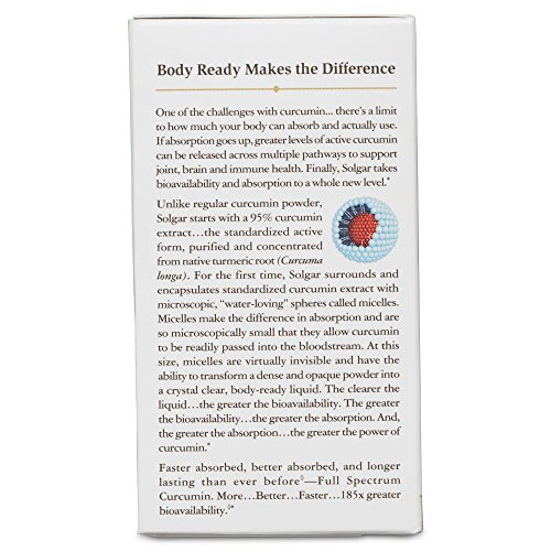 More, better, faster.That's the difference with Solgar Full Spectrum Curcumin. In fact, the bioavailability is 185x better. For the first time, Solgar transforms poorly absorbed curcumin, from a fat soluble to a water soluble phytonutrient making it immediately body ready, faster absorbed and more active than ever before. It's so advanced, just 40 mg of curcumin in one softgel delivers the equivalency of 75 (100 mg) capsules of standardized curcumin extract. Even more, in a recent clinical study, Solgar Full Spectrum Curcumin was shown to be longer lasting so it stays in your system for a full 24 hours. Now, for brain, joint and immune health Solgar changes what you believed was possible from curcumin forever. Solgar Full Spectrum Curcumin one softgel, once a day 185x better. One of the challenges with curcumin there's a limit to how much your body can absorb and actually use. If absorption goes up, greater levels of active curcumin can be released across multiple pathways to support joint, brain and immune health. Finally, Solgar takes bioavailability and absorption to a whole new level. Unlike regular curcumin powder, Solgar starts with a 95% curcumin extract the standardized active form, purified and concentrated from native turmeric root (Curcuma longa). For the first time, Solgar surrounds and encapsulates standardized curcumin extract with microscopic, water-loving spheres called micelles. Micelles make the difference in absorption and are so microscopically small that they allow curcumin to be readily passed into the bloodstream. At this size, micelles are virtually invisible and have the ability to transform a dense and opaque powder into a crystal clear, body-ready liquid. The clearer the liquid the greater the bioavailability. The greater the bioavailability the greater the absorption. And, the greater the absorption the greater the power of curcumin. 0 |