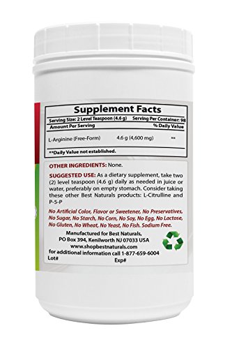 -. Binding : Health and Beauty -. Brand : Best Naturals -. EAN : 0817716014562 -. Feature : Supports Cardiovascular health* / Promotes Nitric Oxide & Protein Synthesis* / Supports Healthy blood circulation* / Supports positive benefits on athletic performance* / All Best Naturals products are manufactured in accordance with Good Manufacturing Practices (GMP), among the highest standards in the world -- Proudly Made in USA -- Purity & Potency Guaranteed -. IsAdultProduct : 0 -. Label : Best Naturals -. Manufacturer : Best Naturals -. PackageQuantity : 1 -. ProductGroup : Health and Beauty -. ProductTypeName : HEALTH_PERSONAL_CARE -. Publisher : Best Naturals -. Studio : Best Naturals -. Title : L-Arginine Powder 1 LB by Best Naturals - 100% Pure - Free Form - Pharmaceutical Grade -. UPC : 817716014562
