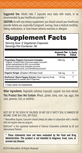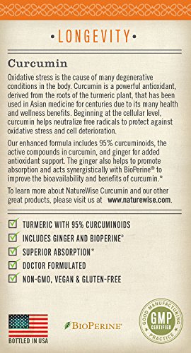 NatureWise Curcumin with BioPerine is vegan, non-GMO and gluten-free. Bottled in the USA, with each batch tested for safety and purity