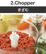 ![]() | 肉・魚(骨・スジを取り、約2cm角切り)は300g、玉ネギ(8等分に切る)は大1個を丸ごとみじん切りできるパワーが魅力。かたいニンジンやナッツから柔らかいパン粉づくりまで、素材※に合わせてスピード調節できるので、料理の下ごしらえも思いのまま |