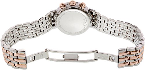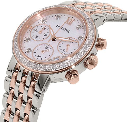 BULOVA DIAMOND MAIDEN LANE COLLECTION: This collection bears the name of the first Bulova store on ManhattanÕs Maiden Lane, the original center of the New York jewelry industry. Bulova Diamonds reinvented, they feature a unique prong setting to intensify the stones brilliance, letting light in from underneath. Select styles glow with lustrous mother-of-pearl. With bold styling and sparkling design, the Bulova Diamond Collection features individually handset Diamonds for non-stop brilliance. In stainless steel with 34 diamonds individually handset on silver-tone and rose gold-tone case and white mother-of-pearl dial, flat mineral glass, six-hand calendar chronograph, deployment closure, and water resistance to 30 meters.Feature