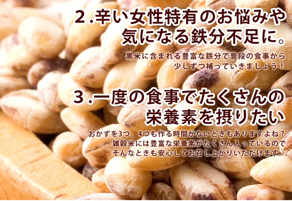 | 原材料 | 丸麦、胚芽押麦、黒米、もち麦、挽割大豆、はとむぎ、もちひえ、もちきび、もちあわ、炒り胡麻 |