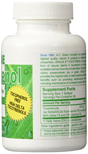 Providing Health Professionals with the highest quality vitamin E products since 1962, A.C. Grace Company once again tops the market with a unique product, the purest form of natural vitamin E tocotrienols at the highest concentration available. Devoid of any fillers, additives, colors, or preservatives. UNIQUE E TOCOTRIENOL is tocopherol-free and provides the highest ratio of delta tocotrienol to deliver maximum health benefits such as promoting cardiovascular and circulatory health, including maintenance of cholesterol levels within the normal range.Feature