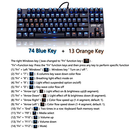 【Adjustable LED Backlit and FN Keys】74 Blue +13 Orange Light.ABS double-color injection molding and constructed with floating keycaps,Uniform light transmission and 6 kinds of Brilliant Backlit effect.Definitely eliminating Keycaps data fade. Easy to adjust backlight, Volume and LED mode etc with FN+F1-F12, save your time and make the operation easier