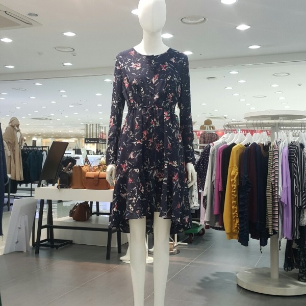 전체 프린트에 라운드형 원피스입니다허리 스트링과언발란스한 라인이 포인트되는 원피스입니다