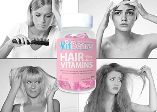 VITBEARS® nourish hair, nails and skin from within. At VITBEARS® we understand that a whole range of factors, including stress, hormonal changes, over styling, poor nutrition, age, menopause, post-pregnancy, and medication can impact on the health of your hair, skin and nails. VITBEARS® supplements are scientifically formulated to help nourish hair, skin and nails and promote existing hair growth* from within. VITBEARS® hair, skin and nail vitamins are formulated for those who were looking for an easy to eat daily vitamin without the struggle of swallowing pills. Improve overall skin, nails and hair health. VITBEARS® supplement is a vegetarian formula. VITBEARS® nourish your hair, skin and nails from within. Vitamin A, Vitamin C, Vitamin D, Vitamin E, Vitamin B-6, Folic Acid, Vitamin B-12, Biotin, Pantothenic Acid, Iodine, Zinc, Choline, Inositol, as the active vitamins and minerals all packed into each of our gummy bears. DIRECTIONS: Take two bears just before your meal every day. CAUTION: If you are taking any prescribed medication, have any medical conditions or are pregnant always consult your doctor or pharmacist before taking vitamins or supplements. Keep out of reach of young children. Do not exceed stated recommended dose. Food supplements must not be used as a substitute for a varied and balanced diet and a healthy lifestyle. Store in a cool dry place. VITBEARS® give you everything you need to grow the healthiest longest hair possible, it does this by: Growing longer and stronger hair Nourishing your hair from within Improving overall health Increasing hair strength Improving hair elasticity Stopping hair breakageFeature
